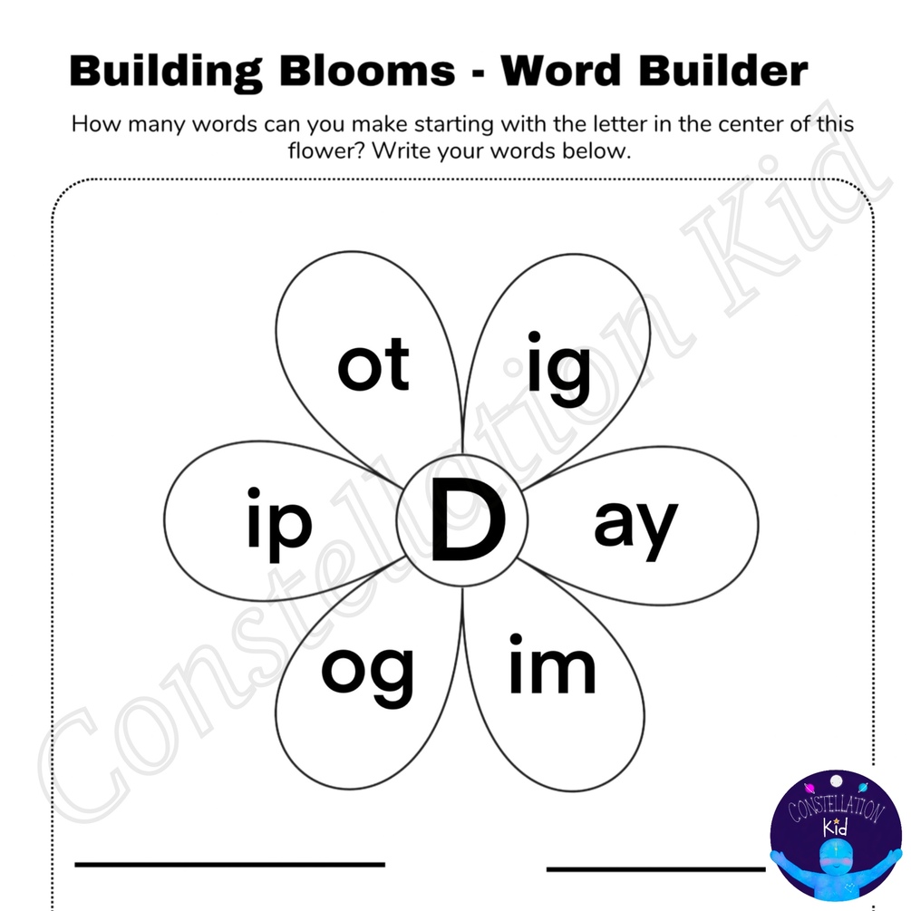 Build words with our Building Blooms! Create words that begin with the letter at the center of each flower. Then write the words in the spaces provided below.