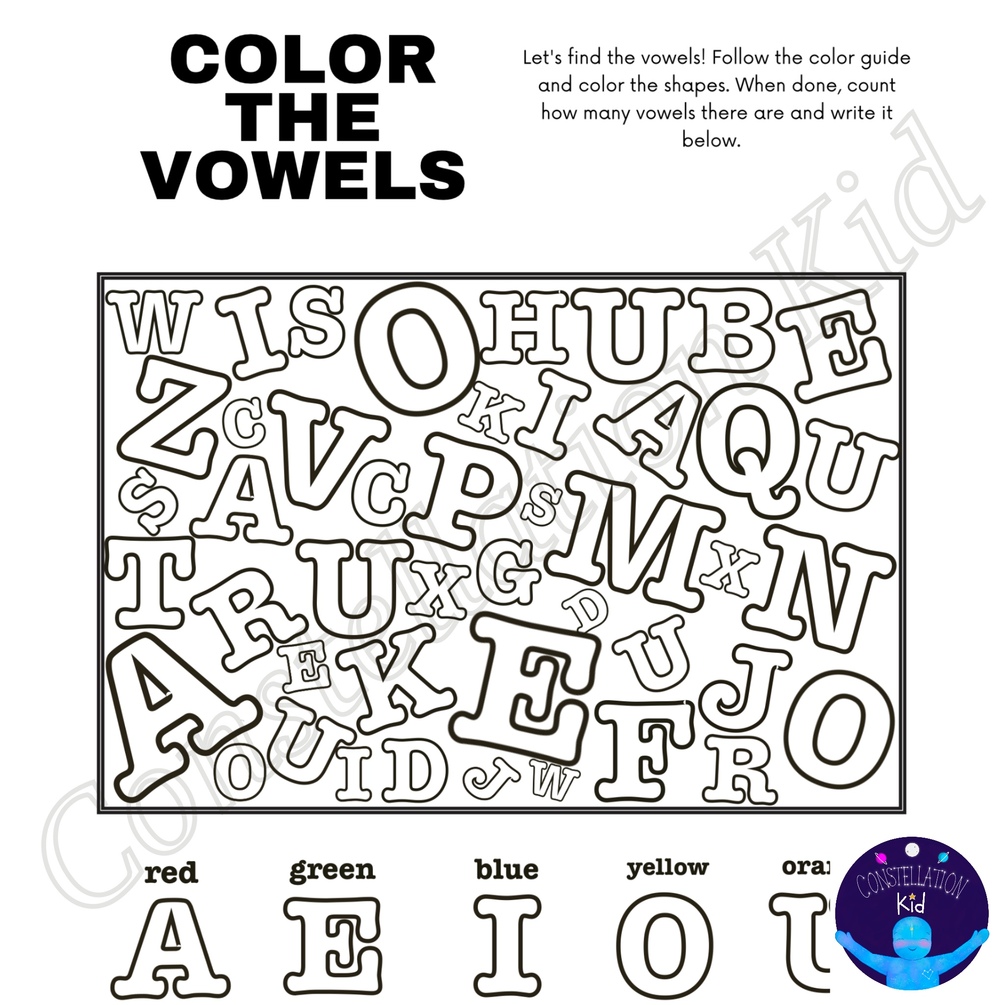 Practice vowel and consonant recognition by finding the vowels hiding a amongst the crowd of letters. Includes color matching and counting.