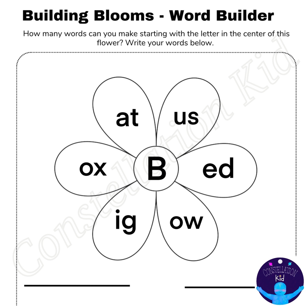 Build words with our Building Blooms! Create words that begin with the letter at the center of each flower. Then write the words in the spaces provided below.