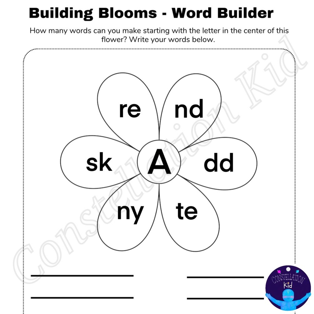Build words with our Building Blooms! Create words that begin with the letter at the center of each flower. Then write the words in the spaces provided below.